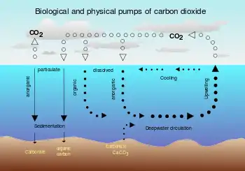 تحتوي محيطات الأرض على كمية كبيرة من ثاني أكسيد الكربون في شكل أيونات البيكربونات والكربونات، وهذه الكمية أكبر بكثير من الكمية الموجودة في الغلاف الجوي. وتنتج البيكربونات عن التفاعلات بين الصخر والماء وثاني أكسيد الكربون، ومن أمثلة هذه التفاعلات انحلال كربونات الكالسيوم: