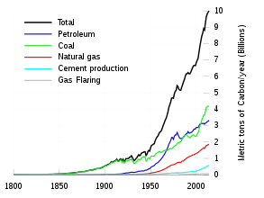 إن إحراق الوقود الأحفوري (مثل الفحم والنفط والغاز الطبيعي) هو السبب الرئيسي لزيادة ثاني أكسيد الكربون من صنع الإنسان، وإزالة الغابات هي السبب الرئيسي الثاني. ففي عام 2010، تحرر 9.14 جيجا طن من الكربون (أي ما يعادل 33.5 جيجا طن من ثاني أكسيد الكربون أو حوالي 4.3 جزء في المليون) في الغلاف الجوي بسبب الوقود الأحفوري وإنتاج الأسمنت في جميع أنحاء العالم، مقارنة بـ6.15 جيجا طن من الكربون في عام 1990.[73]