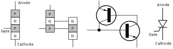يتكون التايرستور من بنية رباعية الطبقات p-n-p-n تضم ثلاث وصلات ثنائية فيما بينها. يطلق على المربط الخارجي المتصل بالطبقة p الطرفية اسم المصعد، والمربط الخارجي المتصل بالطبقة n الطرفية المهبط، والمربط الخارجي المتصل بالطبقة p الداخلية (البوابة).[2]