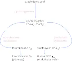 الثرومبوكسان هو مضيق للأوعية الدموية وعامل قوي لارتفاع ضغط الدم، ويسهل تراكم الصفائح الدموية.