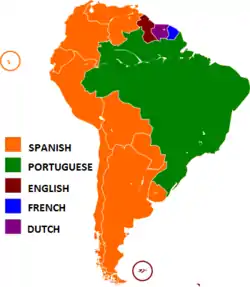 اللغة الأسبانية (193,243,411 ناطق)[15] والبرتغالية (193,197,164 ناطق) [16] هما اللغات الأكثر استعمالا في أمريكا الجنوبية. فالإسبانية لغة رسمية في معظم البلدان، جنبا إلى اللغات المحلية في بعض الدول. والبرتغالية لغة رسمية في البرازيل. والهولندية رسمية في سورينام؛ واللغة الإنجليزية رسمية في غيانا، إضافة إلى أنه هناك على الأقل اثني عشر لغة تستعمل ويتحدث بها كالهندية والعربية. وتستعمل الإنجليزية أيضا في جزر فوكلاند، بينما الفرنسية هي اللغة الرسمية في غويانا الفرنسية واللغة الثانية في أمابا (البرازيل).