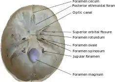 قاعدة الجمجمة، السطح الداخلي والثقبة مشار إليها.