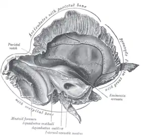 ![]() السطح الداخلي للعظم الصدغي الأيسر. الثقبة الخشائية مبوبة بالأسفل على اليسار. | |