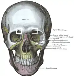 ![]() الجمجمة من الأمام.(الثقب فوق المحجري مشار إليه بالصندوق الأبيض الأيمن). | |