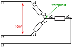 في طوبولوجيا توصيلة ستار، مع تسلسل الدوران L1 - L2 - L3، يمكن حساب الفولتية اللحظية المتغيرة مع الوقت لكل مرحلة A,C,B على التوالي من خلال المعادلة التالية: