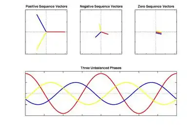 من الناحية العملية، نادراً ما تكون للأنظمة أحمال متزنة تمامًا في التيارات، الجهد والممانعات في جميع المراحل الثلاث. يتم تبسيط تحليل الحالات غير المتوازنة بشكل كبير من خلال استخدام تقنيات المكونات المتماثلة حيث يتم تحليل النظام غير المتوازن باعتباره تراكب ثلاثة أنظمة متوازنة، لكل منها التسلسل الإيجابي أو السلبي أو صفر للجهود المتوازنة. عند تحديد أحجام الأسلاك في نظام ثلاثي الأطوار لا نحتاج سوى معرفة حجم الطور وتيار النيوترال. يمكن تحديد التيار المحايد عن طريق إضافة التيارات ثلاثية الطور معًا كأعداد معقدة ومن ثم تحويلها من مستحاثات. إذا كانت تيارات جذر متوسط التربيع (RMS) ثلاثية المراحل هي: يتم اختصارها إلى ، و . لتكون بذلك قيمة تيار النيوترال المتوسط يساوي: