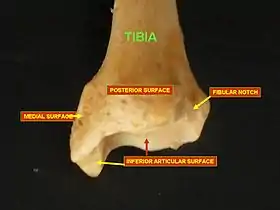 ![]() عظام الساق الأيمن. السطح الأمامي. الثلمة الشظوية (بالإنجليزية: Fibular notch). عظام الساق الأيمن. السطح الأمامي. الثلمة الشظوية (بالإنجليزية: Fibular notch). | |