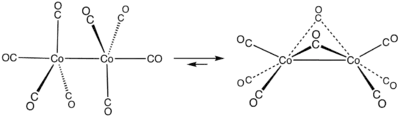 - يمتلك ثماني كربونيل الكوبالت بنيتين، يحصل توازن بينهما كما في الشكل أدناه. في كلا الحاتين تتصل درتا الكوبالت برابطة تكون في إحداهما أطول من الأخرى.