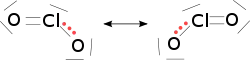 لجزيء ClO2 عدد شاذ من إلكترونات التكافؤ ولذلك هو جذر حر ذو مغناطيسية مسايرة. لقد حيرت بنيته الإلكترونية العلماء لفترة طويلة لعدم الرضى التام عن أي ترتيب ممكن من ترتيبات لويس. في سنة 1933 م اقترح (L.O. Brockway) بنية تتضمن رابطة ثلاثية الإلكترونات.[3] طور الكيميائي لينوس باولنغ لاحقًا هذه الفكرة وتوصل إلى بنيتين طنينيتين تتضمن رابطة مضاعفة في جهة واحدة ورابطة مفردة مع رابطة ثلاثية الإلكترونات في الجهة الأخرى.[4] من وجهة نظر باولينغ فإن التركيب الأخير يجب أن يمثل رابطة أضعف قليلًا من الرابطة المزدوجة.