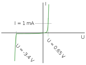 يبين المنحني في الشكل العلاقة بين الجهد والتيار عبر ثنائي أقطاب زينر، ويتميز هذا النوع بجهد انقطاع عند -17 فولت. يعمل الثنائي عادة بجهد موجب عالي في جزء المنحني اليميني ولا يمرر التيار عندما يكون الجهد الواقع عليه بين 0.65 فولت و-17.1 فولت. وعندما نغير الجهد إلى مايزيد عن -17.2 فولت يبدأ التيار في المرور ثانيا ولكن في الاتجاه العكسي.