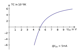ذات درجات الحرارة الحرجة. كبديل، يستخدم ثنائي زينر ذو معامل درجة الحرارة +2 mV/°C (يعني مقاومة المعامل الحراري الموجب في هذه الحالة) ذو انهيار الجهد 6.2–6.3 فولت متصل على التوالي مع صمام ثنائي منحاز إلى الأمام مصنوع من مادة السيليكون (أو ترانزيستور B-E) المصنعة على نفس الشريحة، للجهود المرجعية التي يجب أن تكون مستقرة للغاية على مدى فترات طويلة من الزمن.[8] الصمام الثنائي المنحاز للأمام لديه معامل درجة حرارة −2 mV/°C (يعني مقاومة المعامل الحراري السالب في هذه الحالة). مسببين بذلك إلغاء معامل درجة الحرارة TC.