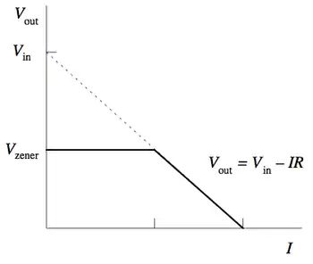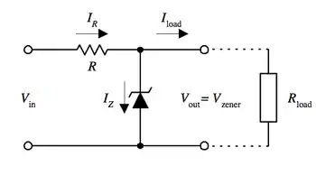 - يجب أن تكون المقاومة R صغيرة كفاية بحيث أن التيار المار ب D يحافظ على D في الانهيار العكسي. قيمة هذا التيار تعطى في ورقة البيانات للثنائي D. على سبيل المثال، هذا الجهاز (ثنائي زينر) الشائع BZX79C5V6[10]. ذو جهد 5.6 فولت وقدرة 0.5 واط لديه تيار عكسي موصى به يساوي 5mA ميلي أمبير. إذا كان هناك تيار غير كاف يمر عبر D، إذا Uout غير منظم وأقل من جهد الانهيار الشكلي، عندما نحسب RK يجب عمل بدل لأي تيار من خلال الحمل الخارجي، غير مبين في هذا الرسم البياني، متصل عبر Uout.