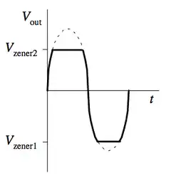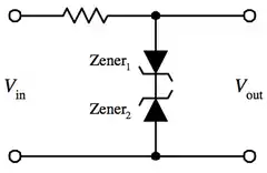 اثنين من الثنائيات زينر التي تواجه بعضها البعض في سلسلة تقطع نصفي إشارة الدخل. دائرة التقطيع يمكن استخدامها ليس فقط في اعادة تشكيل الإشارة، ولكن أيضًا لمنع ارتفاعات الجهد من التأثير على الدوائر المتصلة بمصدر الطاقة.[11]