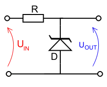 في هذه الدارة، التي تمثل جهد مرجعي نموذجي أو منظم جهد، جهد الإدخال، Uin يتم تنظيمه إلى أن يصل إلى جهد خرج ثابت Uout جهد انهيار الصمام الثنائي D مستقر على مدى مجال واسع ويحافظ Uout على ثابت تقريبا على الرغم من أنه يمكن أن يتأثر جهد الإدخال بالمجال الواسع. بسبب انخفاض مقاومة الصمام الثنائي عند تشغيله بهذه الطريقة، المقاومة R تستخدم للحد من التيار عبر الدائرة.