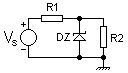 وتبين الدائرة المرسومة بالشكل مصدرا للجهد الثابت VS باستخدام ثنائي أقطاب زينر DZ. وتعمل تلك الدائرة على ضبط الجهد حيث تعمل على تثبيت قيمة الجهد الواقع على الحمل : الممثل بالمقاومة R2، بحيث أن لايتغير ذلك الجهد VS. وتطبق تلك الدائرة عندما يكون التيار المار بالمقاومة ضعيفا أو عندما تكون المقاومة R2 كبيرة ولا تتغير كثيرا. ويمكن بمعرفة التيار (IR2) المار في المقاومة حساب قيمة المقاومة بواسطة العلاقة :
