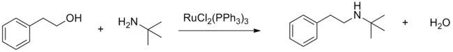 يستعمل المعقد RuCl2(PPh3)3 كحفاز للألكلة النيتروجينية للأمينات باستعمال الكحولات:[5]