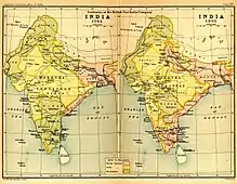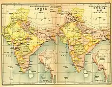 يعود وجود شركة الهند الشرقية البريطانية في الهند إلى سنة 1612[25]، حيث كانت تدير مناطق الشحن العابر للأغراض التجارية البحتة، إلا أن انتصارها في معركة بلاسي في 1757 مثل بداية موطئ قدم قوي للشركة في شرق الهند. ثم ازدادت الشركة قوة بعد انتصارها في معركة بوكسار سنة 1764 على السلطان المغولي شاه عالم الثاني. وبعد هزيمته منح الشاه المغولي الشركة الحق في "تحصيل الإيرادات" في مقاطعات البنغال (البنغال الحديثة وبيهار وأوديشا)، وعرفت عند الشركة باسم "ديواني".[26] وسرعان ماوسعت الشركة أراضيها حول قواعدها في بومباي ومدراس. واشعلت لاحقا الحروب الأنجلو-ميسور (1766-1799) وحروب الأنجلو-مارثا (1772-1818) فاستولت على المزيد من أراضي الهند.[27]