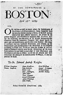|CitationClass=تم تجاهله (مساعدة) - Steele, Ian K (مارس 1989). "Origins of Boston's Revolutionary Declaration of 18 April 1689". New England Quarterly. 62 (Volume 62, No. 1): pp. 75–81. doi:10.2307/366211. JSTOR 366211. الوسيط