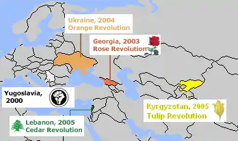 استخدم المشاركون في هذه الثورات المقاومة السلمية والاحتجاجات والمظاهرات مع استخدام وشاح ذو لون محدد أو زهرة كرمز. ومنها ثورة الورد (أو ثورة الزهور أو الثورة الوردية) في جورجيا والثورة البرتقالية أو ثورة البرتقال في أوكرانيا وثورة التوليب (أو ثورة السوسن أو ثورة الزنبق أو ثورة الأقحوان أو الثورة الزهرية) في قيرغيزيا وثورة الأرز في لبنان. وقد أطلق البعض اسم الثورة الزرقاء على المطالبة عام 2005 بمشاركة المرأة في الحياة السياسية في الكويت. وأطلق اسم ثورة الزعفران على تحرك المعارضة في بورما أو ميانمار عام 2007. وأطلق على أعمال الشغب في التبت عام 2008 اسم الثورة القرمزية.