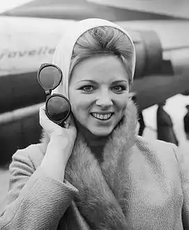 - De actrice bij aankomst, met in haar hand een zonnebril. Dutch Nationaal Archief نسخة محفوظة 14 مارس 2020 على موقع واي باك مشين.