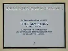 لوحة تذكارية لثيو ماكيبين في منطقة برلين-شمارغيندورف مكتوب عليها (في هذا المنزل عاش منذ عام 1952 ثيو ماكيبين 5-1-1879 - 10-1-1953، ملحن، ومؤلف أوبرات، وموسيقى أفلام تمثيلية من بينها "بيل آمي"