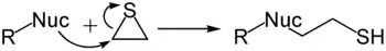 فعلى سبيل المثال يحدث تفاعل إضافة مع الأمينات ليشكل مركبات 2-مركبتو إيثيل أمين،[8] والتي تعد من الربيطات المتمخلبة الجيدة.