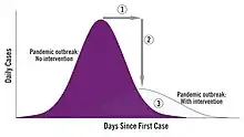 يكمن التدبير المفتاحي بالسيطرة على انتشار المرض المعدي في محاولة تخفيض ذروة الجائحة أو قمتها في المنحنى، التدبير الذي يُعرف بتسطيح المنحنى. يساعد ذلك في إنقاص خطر استنزاف الخدمات الصحية أو إغراقها بالإضافة إلى توفير المزيد من الوقت حتى يتم تطوير لقاح وعلاج له.[8] تشمل التداخلات غير الدوائية التي يمكن اتخاذها -بغاية تدبير انتشار المرض- التدابير الوقائية الشخصية مثل نظافة اليدين وارتداء الأقنعة والحجر الذاتي، والإجراءات المجتمعية من الإبعاد الاجتماعي مثل إغلاق المدراس وإيقاف الفعاليات التي تنطوي على التجمعات الكبيرة، ومشاركة المجتمع في تشجيع القبول والمشاركة في مثل هذه التداخلات، بالإضافة إلى الإجراءات البيئية مثل تنظيف الأسطح.[9]