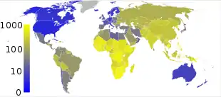 تنتشر الملاريا في المناطق الاستوائية وتحت الاستوائية، بما في ذلك أجزاء من الأمريكتين وآسيا وأفريقيا. سنويًا، هناك ما يقارب 350 إلى 500 مليون حالة إصابة بالملاريا.[101] تشكّل المقاومة المتطورة تجاه الأدوية مشكلةً متفاقمة في علاج المرض في القرن الحادي والعشرين، وهي شائعة حاليًا ضد جميع الزمر الدوائية المضادة للملاريا، باستثناء دواء أرتيميسينين.[102]
