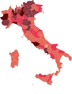 أكد انتشار جائحة فيروس كورونا لعام 2019 ( COVID-19 )، وهو مرض معد جديد تحدث بسبب فيروس كورونا المرتبط بالمتلازمة التنفسية الحادة الشديدة النوع 2 ( SARS-CoV-2 ) في أنحاء إيطاليا في 31 كانون الثاني (يناير) 2020 عندما قام سائحان صينيان في روما كانت نتائج اختبارهم للفيروس إيجابية.[6] وبعد أسبوع، عاد رجل إيطالي إلى وطنه من مدينة ووهان بالصين وتأكد أنه الحالة الثالثة في إيطاليا.[7] أكتشفت مجموعة من حالات كورونا لاحقًا بدءًا من 16 حالة مؤكدة في لومباردي في 21 فبراير،[8] ثم 60 حالة إضافية في 22 فبراير،[9] وأُبلغ عن أول حالة وفاة في إيطاليا في نفس اليوم. بحلول بداية مارس، انتشر الفيروس في جميع مناطق إيطاليا.[10]