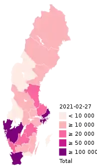 في 13 مارس، بعد تأكيد الحالة الأولى في مقاطعة فاستمانلاند وصل المرض إلى جميع مقاطعات السويد الـ 21.[2]