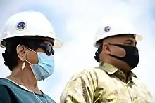 حاكمة غوام لو ليون غيريرو والملازم جوش تينوريو يزوران مرافق طبية مؤقتة في القاعدة البحرية في غوام، 29 أبريل