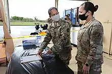 - صورة: الحرس الجوي الوطني لغوام يساعد الشرطة في منشأة مخصصة للحجر الصحي. وُظف الحرس الوطني من قبل الحاكمة لو ليون غيريرو للمساعدة في الجهود المبذولة خلال كوفيد-19.[23]
