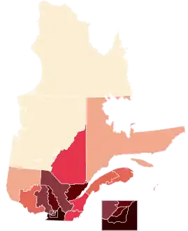 أعداد حالات الإصابة المؤكدة في كل منطقة إدارة صحية في كيبيك. آخر تحديث للأرقام: 30 مارس. |
