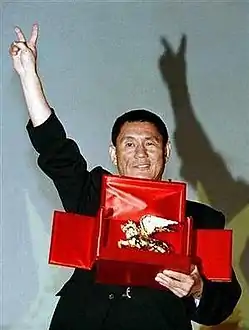 ![]() تاكيشي كيتانو عندما حاز على الجائزة بفضل فيلمه العاب نارية | |