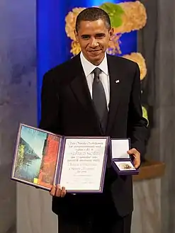 جائزة نوبل للسلام لعام 2009 منحت لرئيس الولايات المتحدة باراك أوباما عن "جهوده غير العادية لتعزيز الدبلوماسية الدولية والتعاون بين الناس".[1] أعلنت لجنة نوبل النرويجية الجائزة في 9 أكتوبر 2009 ، مستشهدة بترويج أوباما لحظر الانتشار النووي و "مناخ جديد" في العلاقات الدولية التي رعاها أوباما،[2] وخاصة في التواصل مع العالم الإسلامي.[3][4] أوباما هو رابع رئيس للولايات المتحدة يفوز بجائزة نوبل للسلام (بعد ثيودور روزفلت، وودرو ويلسون وجيمي كارتر، مع تكريم كارتر يحدث بعد ترك منصبه).
