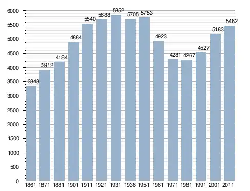 في سنة 1861 بلغ عدد السكان 3٬343 نسمة، وتطور العدد ليصل في سنة 2011 لـ 5٬462 نسمة.