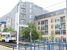 محطة توقف عند شارع رويال حيث في الخلفية يوجد مبنى فيتزجيرالد ، وهو واحد من اثنين من مرافق الإقامة الطلابية الجديدة في جامعة بالتيمور.
