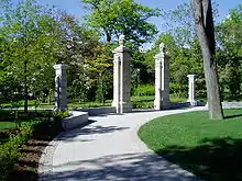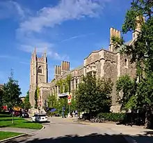 توجد حديقة في الشمال الشرقي لمركز هارت هاوس الذي يُعتبر مجمع مركز الطلاب القوطي. ومن بين غرفه العديدة المشتركة، يشتهر مبنى القاعة الكبير بنوافذ كبيرة من الزجاج الملون وخطبة طويلة من كتاب جون ايلوباجتيكا جون ميلتون حول الجدران.[30][31] يصل ارتفاع برج الجنود المجاور إلى 143 قدمًا (44 مترًا) باعتباره الهيكل الأكثر شهرة في المنطقة المجاورة، حيث خسر قوسه المحفور بأسماء أعضاء الجامعة إلى ساحات المعارك في الحربين العالميتين.[32] يحتوي البرج على جرس كبير يضم 51 جرسًا يُستخدم في مناسبات خاصة مثل يوم الذكرى والدعوة.[33] شمال المبنى الجامعي، يعرض المبنى الرئيسي لكلية الثالوث العمارة الجاكوبيثية تيودور، في حين بُنيت الكنيسة الصغيرة على الطراز القوطي المشابه لكنيسة جيلز جيلبرت سكوت.[34] تتميز الكنيسة بوجود جدران خارجية من الحجر الرملي ومساحات داخلية من حجر إنديانا الجيري، ووالذي بناه بنّاء إيطالي باستخدام أساليب البناء القديمة.[35] ممشى الفيلسوف بالجامعة هو ممر مشاة خلاب مشجر بشجر الإفجيج يربط جامعة تورنتو بكلية الثالوث، وملعب فارسيتي وكلية الحقوق. تقع كلية فيكتوريا على الجانب الشرقي من كوينز بارك، والتي تتمحور حول مبنى رئيسي مُصمّم على الطراز المعماري الرومانسيكي مصنوع من الحجر الرملي الأحمر المتباين والحجر الجيري الرمادي.[36]