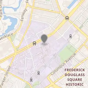 تقع الجامعة في أحياء Fenway وRoxbury وSouth End وBack Bay في بوسطن المجاورة لشارع Huntington بالقرب من متحف الفنون الجميلة وقاعة السمفونية. تُعرف المنطقة أيضًا باسم منطقة فينواي الثقافية.