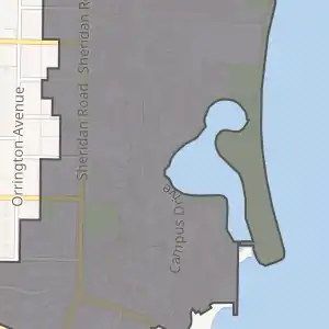 - "صفحة جامعة نورث وسترن (إلينوي) في خريطة الشارع المفتوحة". OpenStreetMap. اطلع عليه بتاريخ 6 مارس 2021. الوسيط