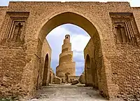 ولقد بني المسجد على مساحة مستطلية يتوسطها صحن مكشوف تحيط به أروقة أكبرها رواق القبلة، ويعد هذا المسجد من أكبر المساجد الإسلامية إذ تبلغ مساحة المسجد 46800 متر مربع، حيث يبلغ طول أضلاعه 260م،180م، وتقع منارة مئذنته الحلزونية خارج السور من الناحية الشمالية في أولى الزيادات التي أضيفت للمسجد في العهود التالية، وتتميز منارة هذه المئذنة بتصميم فريد لم يظهر من قبل في عمارة المساجد الإسلامية حيث أقيمت على قاعدة مربعة ارتفاعها ثلاثة أمتار، ويرتفع فوق هذه القاعدة برج حلزونى درجاته من الخارج، وتذكرنا هذه المئذنة الحلزونية بشكل الأبراج البابلية المدرجة كالزقورة التي وجدت في آثار العراق.[1]