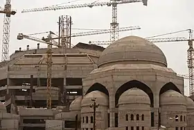 والمسجد محاطا بمباني حديثة البناء، وكان من المفترض أن تبنى لهُ قبة عالية طولها 60 مترا، وقطرها حوالي 300 متر. ولكن بناء هذا المسجد كان في مرحلة مبكرة حتى عندما توقف العمل، حيث بني مع بعض الأعمدة المركزية فقط.