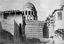 له بابان أحدهما من منطقة البحصة وهو الباب الكبير القديم وباب صغير حديث من شارع الملك فؤاد، وباب البحصة عال فيه زخارف ومقرنصات بديعة آخذة في الانهدام وإلى جانبي الباب واجهة متينة حسنة الزخرفة من حجارة سوداء وبيضاء فيها شباكان أحدهما مشرف على الصحن وتحته سقاية والآخر مشرف على المسجد.