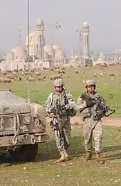 جنديان من قوات الجيش الأمريكي قرب مبنى جامع الموصل الكبير في عام 2007