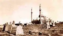 وقال ياقوت الحموي: «وبها - أي حمص - دار خالد بن الوليد، رضي الله عنه، وقبره فيما يقال، وبعضهم يقول إنه مات بالمدينة ودفن بها وهو الأصح، وعند قبر خالد قبر عياض بن غنم القرشي، رضي الله عنه، الذي فتح بلاد الجزيرة، وفيه قبر زوجة خالد بن الوليد وقبر ابنه عبد الرحمن، وقيل: بها قبر عبيد الله بن عمر بن الخطاب، والصحيح أن عبيد الله قتل بصفين، فإن كان نقلت جثته إلى حمص فالله أعلم، ويقال: إن خالد بن الوليد مات بقرية على نحو ميل من حمص، وإن هذا الذي يزار بحمص إنما هو قبر خالد بن يزيد ابن معاوية، وهو الذي بنى القصر بحمص، وآثار هذا القصر في غربي الطريق باقية».[2]