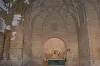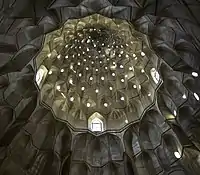 وتقوم على الغرفة أعلاه قبة مقرنصة مخروطية يبلغ ارتفاعها 13.30 متر، واستخدم المعمار هنا المقرنصات للحصول على هذا الشكل المخروطي المقبب من الخارج والمكوّن من حنايا ذوات عقود مدببة مائلة أو بارزة إلى الامام من الداخل. ويبلغ عدد صفوف المقرنصات من الداخل اثني عشر صفاً صممت الثلاثة الأولى من الأسفل بتقنية خاصة، أما الصفوف التسعة التالية فيتألف كل صف منها من ست عشرة مقرنصة أو حنية تميل إلى الداخل كلما ارتفعت إلى الأعلى وتنتهي بشكل نجمة ثمانية ترتفع فوقها قبة ثمانية ايضاً يتوجها رأس مخروطي مدبب.