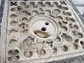 مصفاة من الرخام المنحوت في الصحن (لتصفية مياه الأمطار)