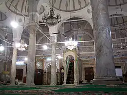بيت الصلاة في الجامع يوجد له ثلاثة أبواب رئيسية مقوسة الشكل مزينة بالرخام والنحوت البارزة على شكل ورود. ويوجد ببيت الصلاة تسعة أعمدة رخامية طويلة تيجانها ذات شكل العمارة التوسكانية المجددة، وفي أعلاها 15 قبة مزينة بالزخارف والرسومات والآيات القرآنية بخط أندلسي. في حين زينت جدران المسجد بأشكال هندسية ونباتات وأزهار مختلفة. يوجد في صحن المسجد مرافق البناء من دورات مياه وأماكن توضئ المصلين، إضافة للمقبرة التي دفن بها مصطفى قرجي.[1]