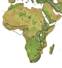 مناطق جبال إفريقيا. I. غرب أفريقيا ومرتفعات الكاميرون، II. المرتفعات الإثيوبية والعربية ، III. الصدع الغربي (ألبرتين)، IV. الصدع الشرقي. V. الصدع الجنوبي ،VI. المرتفعات الشرقية ، VII. دراكينسبرغ