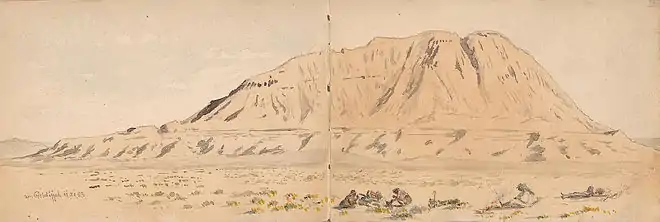 واكتشفت كذلك أن هذه المنطقة على الرغم من كونها صحراء حَجِرة فحسب، تحتوي على مراع أفضل من الأراضي الغرانيتية الواقعة في الجنوب فالحث الطري بطبيعته يتفاعل بسهولة مع الماء ويسمح بأن تخترقه، لذا فإن كل المنطقة التي جبتها ما بين الباعور وجبل جلدية مثلّمة ولا تحتوي إلا على القليل من الرمل مما يساعد على نمو الخضار. وهي أخيرا تملك عدداً كبيراً من الغُدْران التي تحتفظ بالماء حتى شهر أيار في مواسم الشتاء الممطرة.[17]